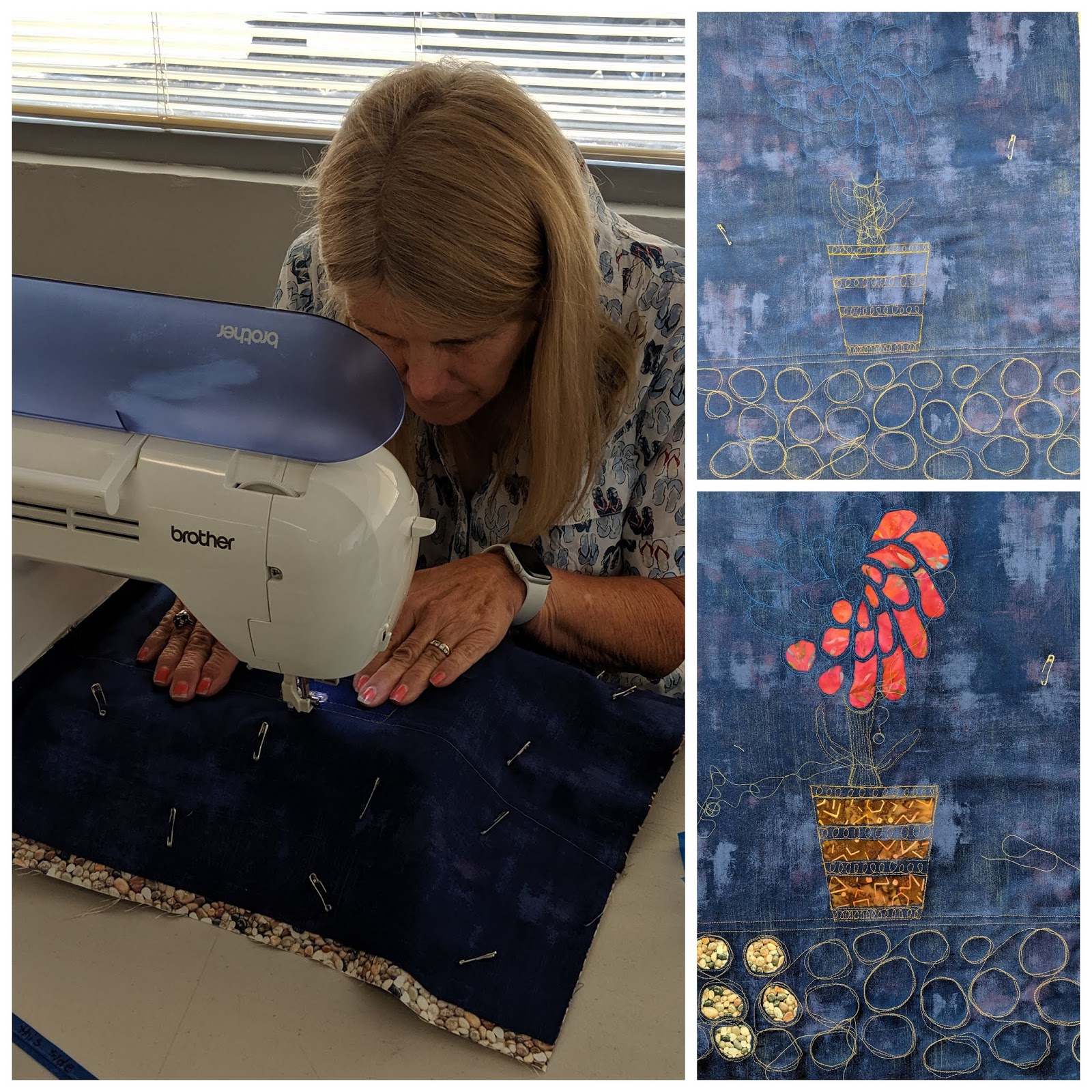 In addition to a wonderful venue, we had an equally fabulous group of quilters participating in the workshop. While you could hear the sounds of bowling balls taking down pins, and quite a bit of Woo Hoo'ing in the lanes just outside the workshop space, there was lots of focus inside the classroom!! Below are just a few snapshots of each participant's progress on their own unique floral Mod Mola designs, complete with careful layering, stitching, and cutwork reveals!