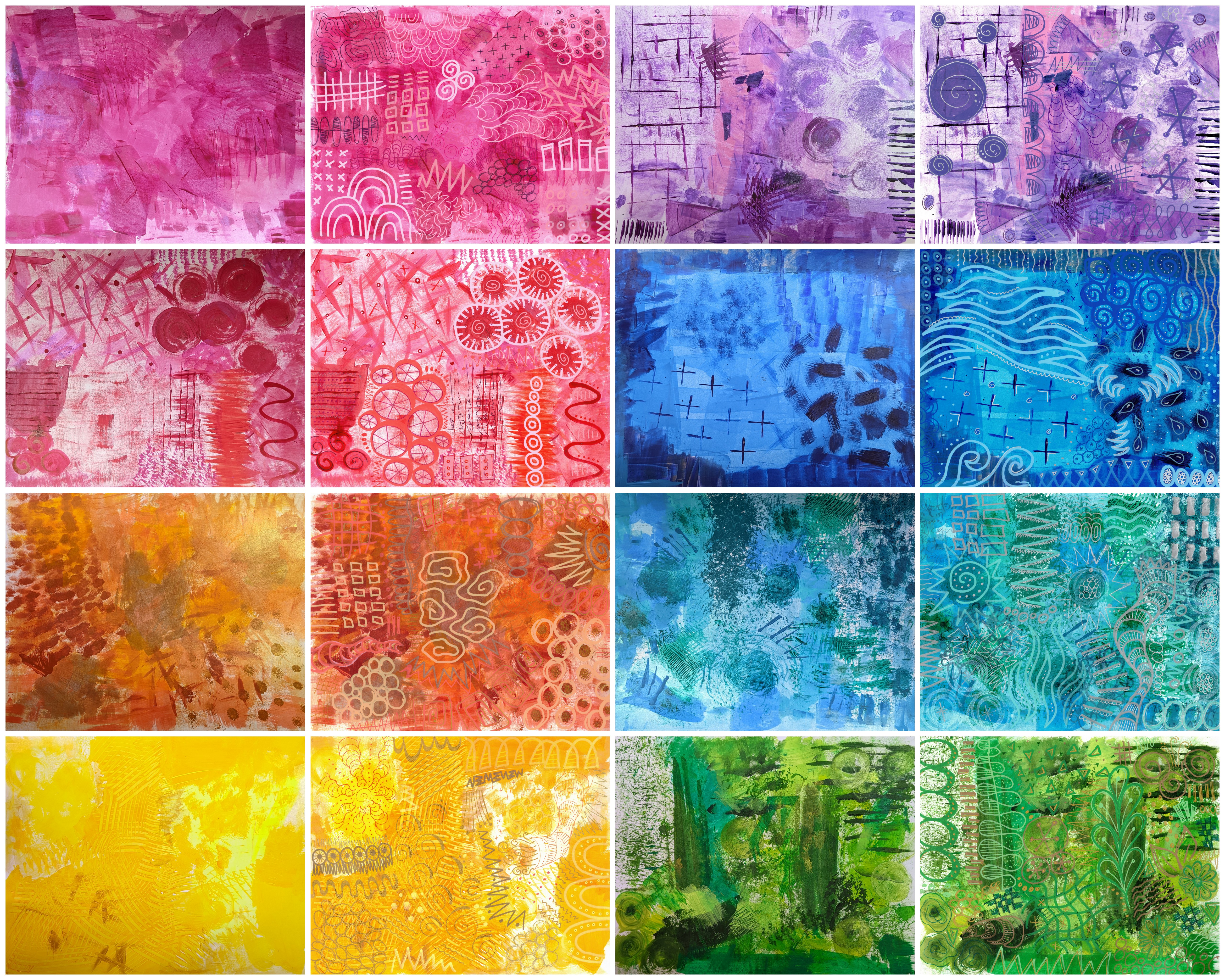 The first step involved sorting out all the various acrylic paints and inks by color. This proved to be a valuable exercise on its own as I could quickly gauge my favorite colors and where there were gaps to fill. Once the paints were sorted, it was time to cover your page with that one color range. I used an assortment of brushes, rubber scrapers, gift cards, etc to apply the paint to create a variety of textures. Of course, it was only a matter of time until I started to jump ahead into the mark-making!