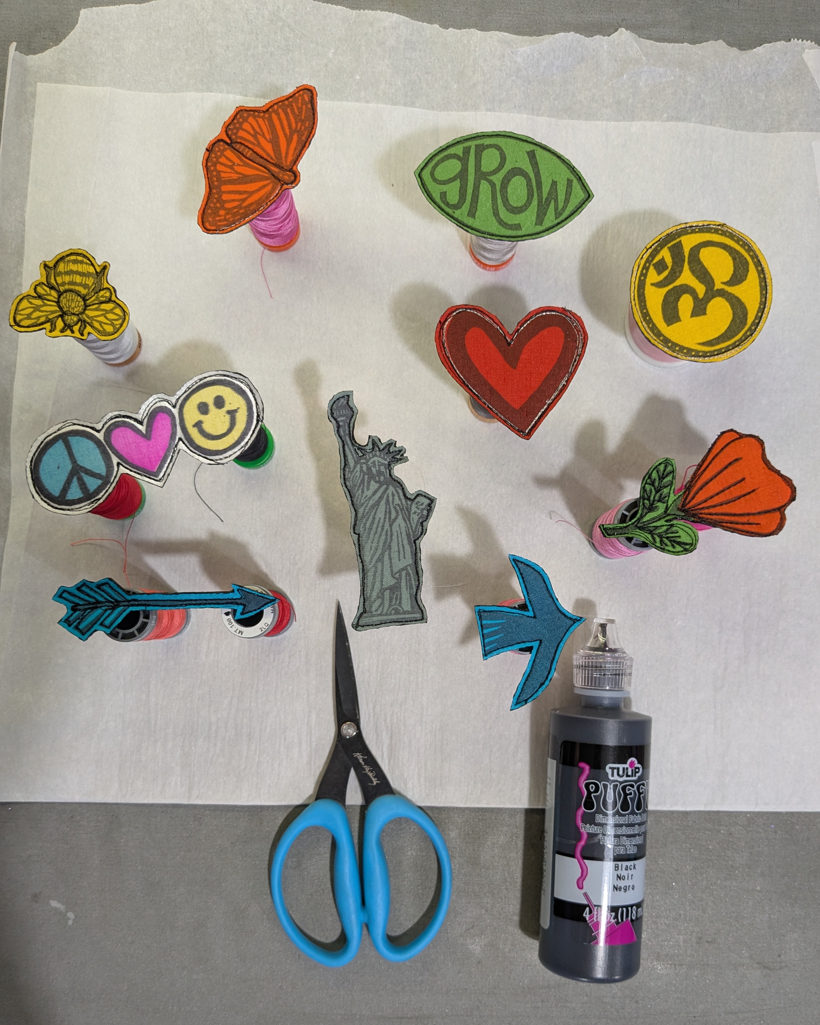 Each symbol was then trimmed close to the stitch line. The raw edges were painted with Tulip Dimensional Fabric paint before propping up onto spools of thread to air dry.